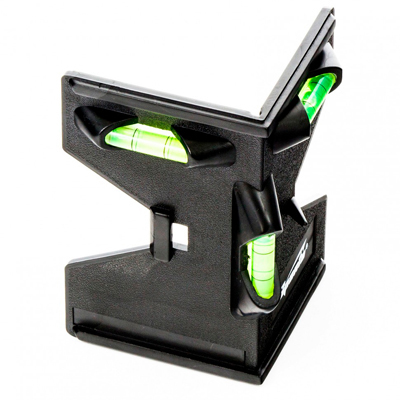 Многофункциональный уровень изготовлен из ударопрочной пластмассы. Имеет угловую форму, позволяющую производить измерения под разными углами на различных поверхностях. Имеет три цилиндрических глазка.