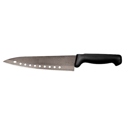 Поварской нож. Имеет очень широкую сферу применения: шинкование овощей, разделка мяса и т. д. Тефлоновое покрытие полотна и технологические отверстия на отфрезерованной части лезвия облегчают рез, увеличивают его эффективность и исключают прилипание продуктов к полотну. Длина лезвия 210 мм. Эргономичная рукоятка оснащена защитным протектором для пальцев.